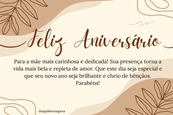 Feliz aniversário para a mãe mais carinhosa e dedicada! Sua presença torna a vida mais bela e repleta de amor. Que este dia seja especial e que seu novo ano seja brilhante e cheio de bênçãos. Parabéns!