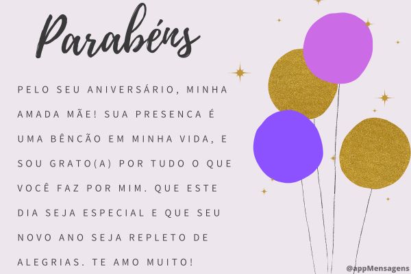 Parabéns pelo seu aniversário, minha amada mãe! Sua presença é uma bênção em minha vida, e sou grato(a) por tudo o que você faz por mim. Que este dia seja especial e que seu novo ano seja repleto de alegrias. Te amo muito!