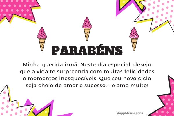 Parabéns, minha querida irmã! Neste dia especial, desejo que a vida te surpreenda com muitas felicidades e momentos inesquecíveis. Que seu novo ciclo seja cheio de amor e sucesso. Te amo muito!