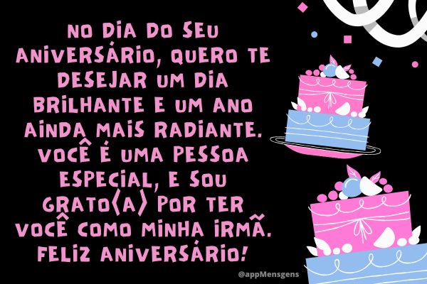 No dia do seu aniversário, quero te desejar um dia brilhante e um ano ainda mais radiante. Você é uma pessoa especial, e sou grato(a) por ter você como minha irmã. Feliz aniversário!